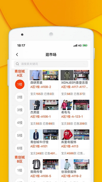 可以在该平台中进行逛市场,该市场分为A区和B区,在不同的区域中还可以选择楼层,每层的商品都是不同的,在线即可查看每个商品的总销量和剩余数量。