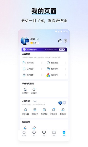第四个是“我的”,在这里其实就是一些具体的设定和查看界面,比如之前收藏的节目或者是管理智能家居产品、闹钟等等,用户还可以在这里管理个人声纹。