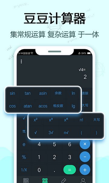 豆豆计算器是一款电子计算器软件,软件界面简洁,功能强大,内置将汇率、房贷、个税、标准计算器融为一体,是一款全面的计算器。软件可以让你的生活变得便利,当你需要计算车贷房贷的时候,豆豆计算器软件就能轻松帮你搞定计算,内置一套计算流程你只需输入相对于的数字就能轻松知道你的房贷车贷。还可以对函数、幂函数、三角函数、反三角函数计算,也是学生学习的利器!