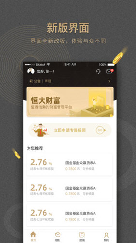 恒大财富APP是一款由恒大出品的智能理财软件,软件拥有健全的风险管控体系,智能化的理财产品,为客户提供专业可信赖的服务,依托恒大集团强大的品牌实力和产业背景,以财富管理为基础,以社区金融为特色,以基金管理与销售为龙头的发展战略,是你积累财富的最佳选择。