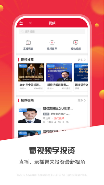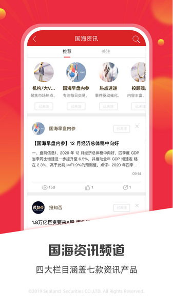 现今,大多数人都会选择将自己的积蓄或者闲散资金购买理财产品,从而钱生钱,但理财投资里面的水很深,让很多想要入门的新手苦不堪言,如今,国海证券为大家带来了国海金贝壳手机版应用,应用名为国海金探号,能极大程度的帮助用户投资理财。国海金探号全新出发,启用全新的使用界面力求提升用户体验。用户可以随时随地查看国海资讯频道,四大栏目,涵盖七款资讯产品,让用户掌握第一手资讯,紧跟风向,让投资变得一帆风顺。用户还可以观看大神的教学直播,录播,全面详细的教学,大神独特的观点,为用户带来投资的最新视角,并且有多名投资顾问,免费签约,用户取得盈利,才会对资讯进行收费,用的安心,让用户不在投资之路上走弯路。应用内置智能机器人,24小时全天为你解答疑惑,为你智能选股。想要投资理财的朋友一定不要错过这款应用,快来下载吧。