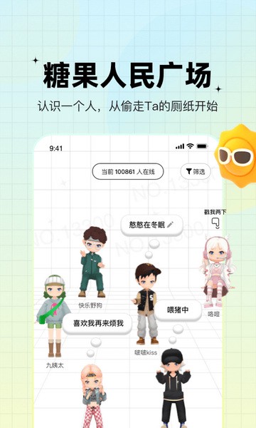 今天小编带来的就是一款画风非常卡通治愈的全新类型的社交app,它就是糖果app。糖果app据说是一款专为后浪,也就是年轻人这个群体所打造的全新的社交平台,其强大的策划阵容和独特新颖大大社交玩法,只为了能够打造出一种更懂年轻人的社交生活方式。糖果app的软件界面设置的十分卡通可爱,还有十分Q萌卡哇伊的人物形象来代表每一个用户,大家还可以根据自己的喜好来对人物进行换装和调整五官,丰富的样式选择完全可以让用户们自由diy出属于你自己的专属造型。此外,糖果app的配色也都非常的治愈,还有各种画风温馨的趣味场景,大家还可以与平台上的其他用户进行聊天和互动沟通等,软件内更为大家提供了非常多个小游戏可以一起玩。