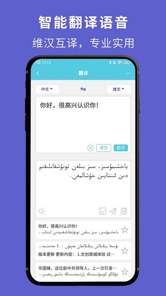 1、智能翻译:支持维语、塔吉克语、汉语、英语、俄语等多语言互译,新疆维吾尔语语言库,维文聊天很方便,翻译精准。
