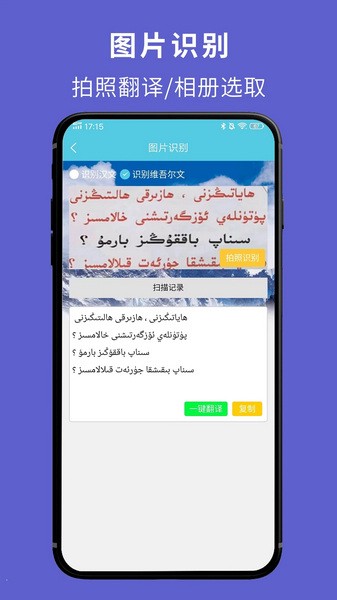 2、图片识别:维语汉语文字识别,扫描识别图片上的维文字和汉文,工作上使用非常实用。