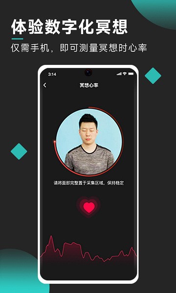 AI加持的正念冥想助理,可识别眼睛、皱眉以及晃动,并以曲线图展示冥想过程的稳定性,帮助你更好提升自己。使用过程极其简单,只需像自拍一样将手机固定在身前,人脸识别技术将自动检测是否眼睛状态并给出相应的引导。