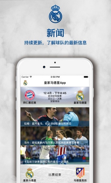 皇马官方app是为广大皇家马德里的球迷们精心准备的一款手机应用软件,用户通过使用皇家马德里官方app可以随时随地通过手机获取便捷的掌上皇马的最新资讯,是一款非常不错的手机应用软件哦!