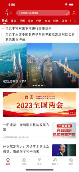 1、首页:热点资讯、头条快报、群众号、时政、锐评、经济、社会等。