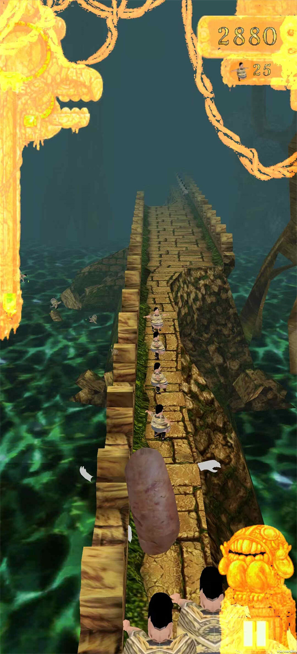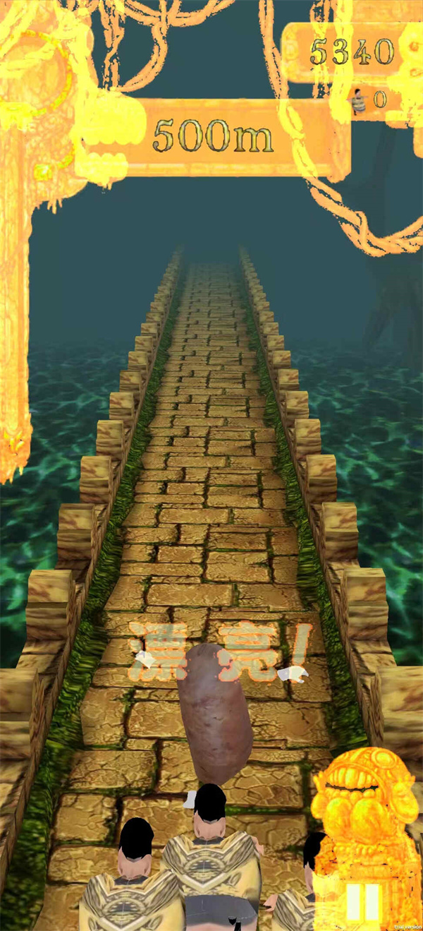 2、操作逻辑延续自经典的神庙逃亡游戏,玩家需要控制焖子左右移动、跳跃,以躲避良子的追击。