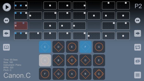 3、接着在下面键盘中安处你的琴键,按完后点击右箭头进入下一行编辑