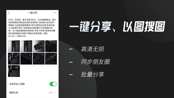 发布到云相册的商品支持一键分享至朋友圈,微博,抖音,小红书,Facebook,qq,支付宝等各大社交平台。