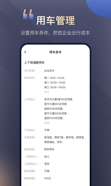 1、线上审批:负责出行的人可以在线处理人工的用车申请;