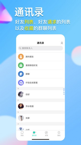 消息:仟信可与自己的微商好友进行发送文本,视频,短视频,语音,图片,表情,等沟通交流。