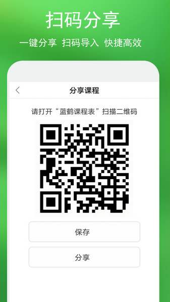 支持一键分享给同学,支持直接扫描立即导入课程表,并支持修改成自己的个性课程表。