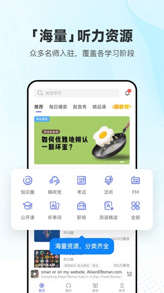 兴趣学习:有声读物、名人演讲、公开课、少儿英语、影视英语等丰富资源。