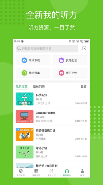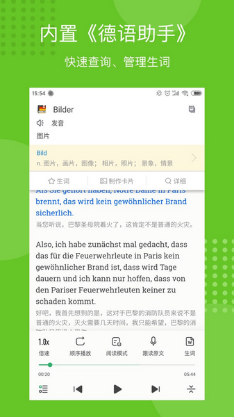 - 听力集锦:日常对话、欧标速成、德语影视、演讲访谈等丰富德语资源。