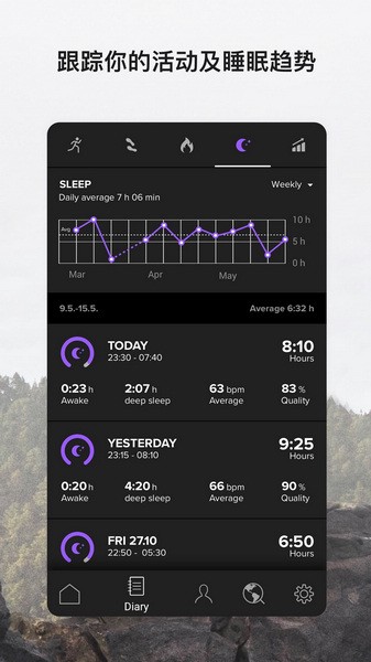 Suunto APP 帮您掌控生活和运动。在锻炼摘要中跟踪关键活动详情,并跟踪您的活动、每日步数、卡路里和睡眠的趋势。