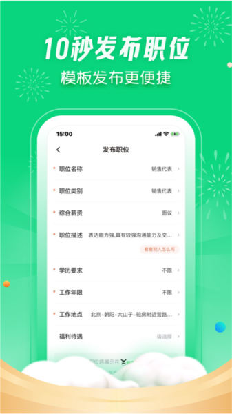 销售、厨师、客服、司机、服务员······职位描述不用手动写,全行业的个性化模板,选中职位发布,10秒就搞定~