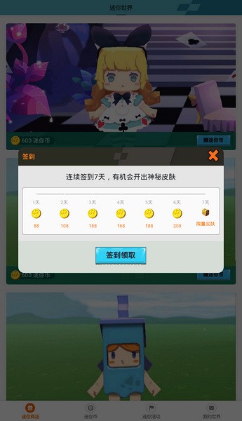 4、丰富签到好礼:提供签到和任务系统,玩家每天签到及完成任务可获得迷你币,用于兑换各种丰富的皮肤,让你拥有更多选择。