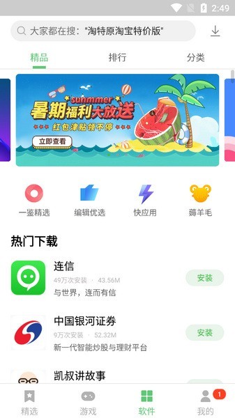 新品速递,流行指数,多种有时效性的深度的专业的推荐,可在编辑推荐板块直接下载。有最具争议的应用PK,最具噱头的应用故事,最深入的应用剖析,最应景的应用推荐,还可以进行用户评价的反馈互动,让用户真正地畅享娱乐生活。