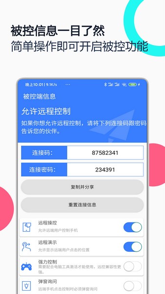 2、你想让别人远程控制你的手机,那么可以在被控中查看连接码和连接密码,告诉你的朋友就可以了;