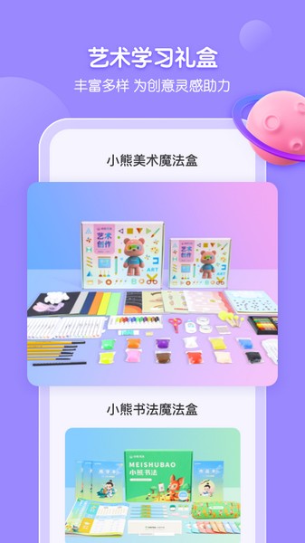 小熊艺术app适用于儿童的各个学习场景。美术、书法等课程的分步式引导符合儿童身心发展,科学细致地划分学习阶段,让学习变得更有针对性。趣味动画情景互动激发兴趣,主动表达,提高学习效率。应用内贴心搭配艺术礼盒,丰富的材料和多样的花样为创意灵感提供充足的准备。而“陪伴”式学习指导则为孩子提供即时反馈,感受到成长的鼓励。