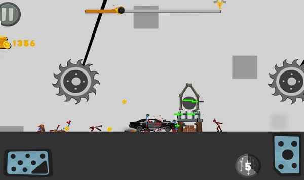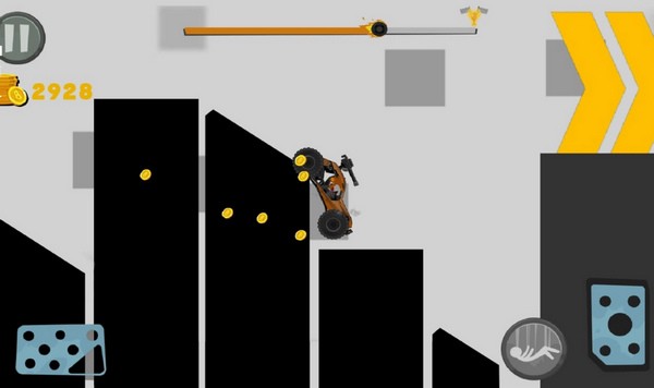 操作很简单,左边滑动控制方向,右边点一下就能加速。每次撞东西都能获得金币,金币可以用来解锁新车和皮肤。我还挺喜欢这种设计的,虽然有些车撞起来更爽,但普通玩家也能通过技巧赚到足够的金币,不会有太大的不平衡感。
