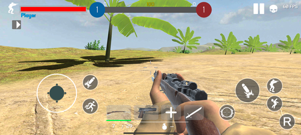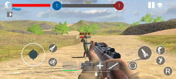 四、进入战场后,我们可以看到是坦克的第一人称视角,左边是摇杆操作移动,右边则是开火,在血条旁边的则是瞄准镜,非常有意思的是,当你击出一炮弹后,会有一个5秒的重新装弹时间,点击下方的小子弹则可以选择机枪模式,炮弹击出还可以看到真实的炮弹下落情况,不得不说,这物理引擎蛮有意思的。