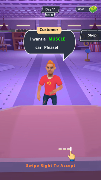 1、新手快速入门:点击屏幕开启游戏,右滑接受顾客需求交易,通过修理车辆或直接售卖积累初始经营资金。