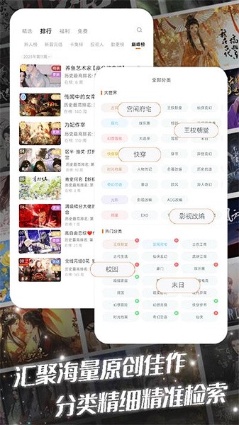 APP汇聚数万部热门作品,古风类包含宫斗宅斗、宫廷权谋、江湖仙侠、修仙玄幻等,现代类包含豪门、娱乐圈、校园、名利场、怪谈等,还有奇幻类、悬疑类、兽世、异世玄幻等等……多元剧情任你挑选,每一部作品都是你专属的创意世界。更有海量免费佳作,让你畅享阅读的乐趣,无限畅玩!