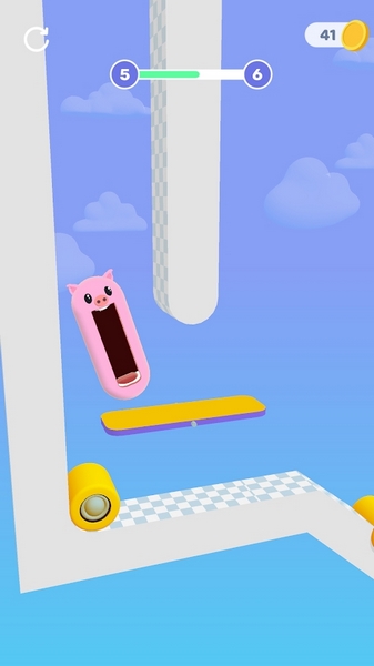 1、进入游戏,操控角色(如粉色小猪、卡通人物等)在轨道上移动,张嘴接住道具/金币。