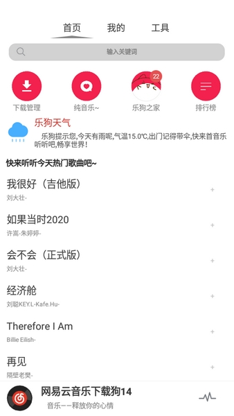 网易云音乐下载狗是一款可以免费下载网易月音乐中的手机APP,其中需要会员权限的歌曲也是可以直接下载的。用户可以直接在软件中搜索并下载,同时也可以登录自己的帐号来下载整个歌单,操作非常简单。软件还内置了播放功能,可以先听再下。此外这里还有很多实用的音乐小工具可以使用。