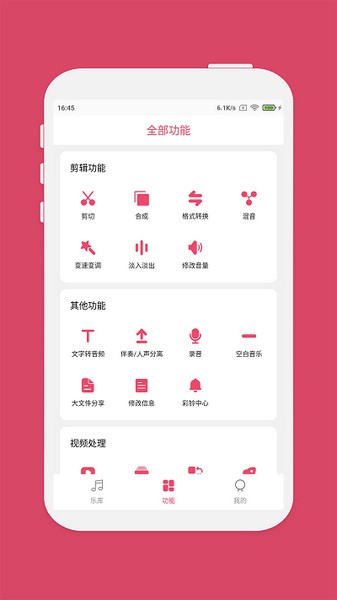 2、可以自己选择你要音乐/歌曲的哪一个部分做你的铃声,支持音频的剪辑、音频的混合、音频的合并以及音频转换器等;
