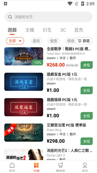-涵盖类目:游戏软件,游戏主机,游戏周边,硬件外设,3C数码,点卡充值,自创服饰-涵盖平台:steam、origin、uplay、Playstation、XboxOne、Switch、NS、PSV、PSP,3DS、Rockstar、battle、Bethesda、GOG等-涵盖类型:动作冒险,角色扮演,策略战棋,模拟经营,体育竞技,休闲益智,多人联机,独立游戏等