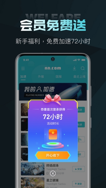 NN加速器是一款非常实用的游戏加速处理的软件,若是玩游戏时网络状态不佳,那么便可以使用这款软件进行加速处理,其界面简约清爽,功能丰富强大,新手注册还可享受72小时免费加速福利,且支持各大当前热门的网络手游加速,例如英雄联盟手游、PUBG MOBILE、王者荣耀、EVE国际服、和平精英等,满足你的游戏需求!