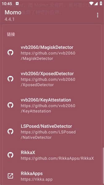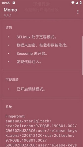 Momo环境检测最新版是一款专用于手机运行环境检测的软件。这款软件可以检查用户手机是否处于ROOT或者Xposed状态,让用户能够对于需要这两种框架安装使用的软件有明确的认识,对手机的安全稳定使用有一定的帮助。软件仅有检测功能,无法根据检测结果来对系统进行调整,如果用户想要更改手机状态的话则需要其他软件的帮助或者手动调整。