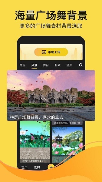 用户可以在舞记平台搜索各种背景素材,录制广场舞视频的时候就能选择自己喜欢的素材进行录制了