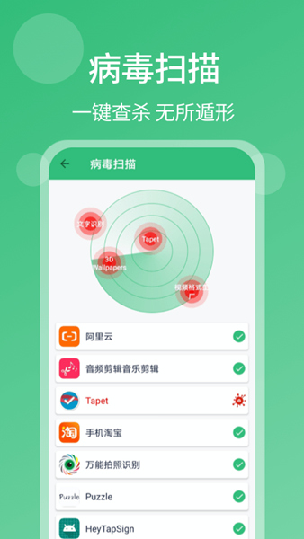 采用独有的云病毒查杀系统深度扫描手机查杀病毒,天天更新病毒库,无需升级,天天杀毒。