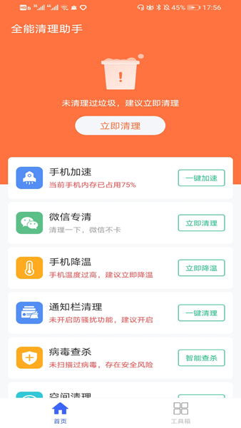 全能清理助手安卓版软件是一款非常强大的垃圾清理工具,可以对手机上的各种无用文件和数据进行深度清理,让手机性能恢复到最佳的状态。软件还具备了内存优化功能,可以对无意义的后台进程进行清理,可以有效解决手机运行卡顿以及耗电过高的问题。此外这款软件还拥有防护能力,当手机负载过高,或者是遇到恶意入侵时就会发出提醒并提供解决方案。1. 提供了多项功能,包括:手机清理,手机加速,wifi加速,手机降温,病毒查杀,通知栏清理等实用功能;能够帮助用户提高手机性能。