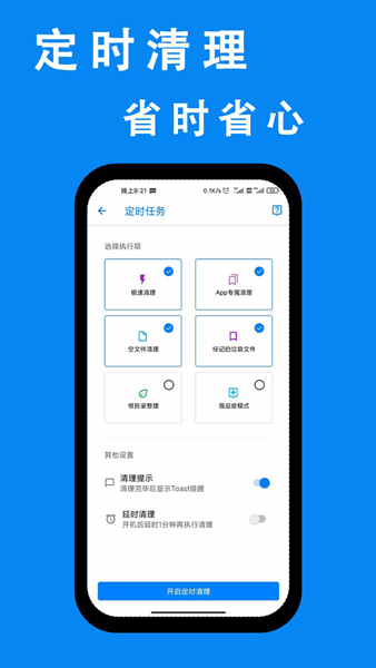 1、可以帮助您对垃圾进行定时清理,以后就能快速清理手机每天产生的垃圾了;