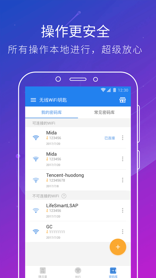 WiFi管家实时在线,帮助你管你的WiFi列表,保障你的安全使用;