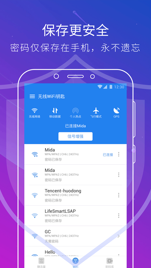无线WiFi钥匙是一款非常可靠的WiFi连接APP,它能使我们在连接WiFi时保护我们的手机上的信息不被泄露,特别是当我们在公共场合时会有一些免费的WiFi,而这些不明来历的无线网络其实是很危险的。此外软件还有无线密码保存成本地文件,即时我们清除了WiFi的密码,也能通过这款软件进行查看。而软件还有一个非常实用的信号增强功能,增加网速的同时也增加了我们的行动范围。●WiFi连接安全:连接公共WiFi常遇到不安全WiFi,泄露自己的信息,相比WiFi万能钥匙,我们不破解WiFi密码,我们更注重安全