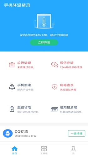 手机降温精灵APP是一个手机工具类的应用。你的手机是不是用一会儿就会发烫?你的手机内存是不是经常不够用?你的手机是不是经常卡顿?这款软件可以帮你轻松解决这些问题。它可以跟不同手机的机型,在使用者们在感到手机发烫时来清理占比CPU进程较高的应用,从而降低手机的温度。它还可以帮助你的手机清理垃圾释放内存,让你的手机不再卡顿!除此之外,该应用还会时刻保证你手机的隐私安全,并使你不会受到垃圾信息的骚扰。1、移动电话冷却精灵是用于用户的移动电话冷却软件的工具。