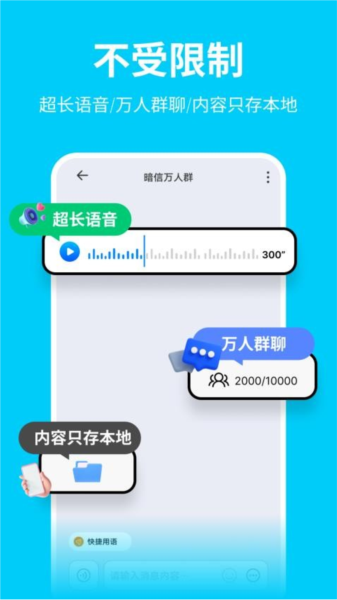 暗信app,一款专注于隐私保护的社交类软件,以独创的加密技术为核心,为用户提供了一个安全、私密的交流平台。在这里,每一句对话都被赋予了安全的外衣,从锁屏密码到聊天内容的伪装,再到好友信息的隐藏,每一步都彰显着暗信对于用户隐私的极致尊重。支持万人群聊,让团队沟通无界限,不论是家族聚会还是工作协作,暗信都能轻松应对,提升群体沟通的效率。