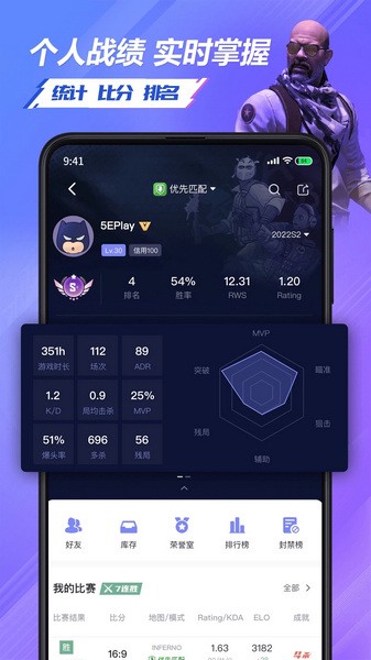 5EPlayapp是一个专为CSGO玩家设计的多功能游戏和社交软件,它不仅提供最新的电竞资讯、赛事安排和比分数据,还设有社区交流功能,方便玩家们一起讨论和分享游戏技巧。软件的一大亮点是其强大的数据分析系统,能够实时记录每局比赛的数据,并通过图表形式展示,让玩家更好地了解自己的表现。