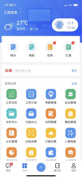 汇办公是移动办公门户,可实时接收各类信息推送,如流程任务、个人日程、会议通知、邮件通知等,并可配置门户常用功能,随时随地开展工作。