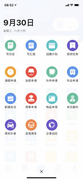 5、添加:写日志、写汇报、创建计划、安排任务、请假申请、加班申请、补休申请、外出申请。
