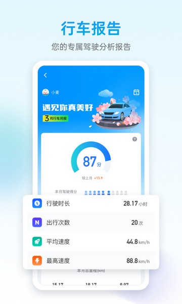 3、行程管理:方便查看历史轨迹、行程记录、停车位,系统自动分析驾驶行为并给出驾驶评分