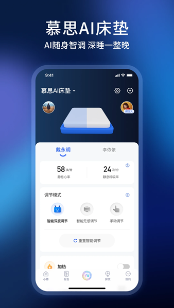 智慧慕思是一款智能家居控制软件,支持慕斯集团的各种智能产品,比如开关、床和床垫。它能调节床垫软硬度,还能根据头颈状态调整枕头,帮助用户睡得更好。软件还有睡眠监测功能,实时记录心率、呼吸和体动数据,还能生成睡眠报告,分析深睡浅睡时间,并给出评分。另外,它还能连接按摩椅、体脂秤等设备,管理体重和健康。