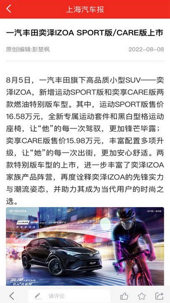 这个软件还有音频、视频和漫画这些丰富的内容形式,让看车闻变得更有趣了。特别是“大咖观点”栏目,专业分析报告特别有参考价值。我觉得对于汽车爱好者来说,这款app确实是个不错的选择,既能满足阅读需求,还能参与互动创作,挺有成就感的。