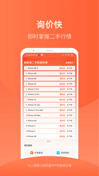 拍机堂APP是一款专门为了解决广大网友买卖二手科技产品的问题打造的购物软件,软件内品类齐全,用户能找到各种各样的3C数码产品,用户想得到的拍机堂都有。软件内多名专员为二手数码产品进行全方位深度质检,如果用户是卖家,可以更好的了解自己产品的情况从而预估自己能卖出的最高价格,如果用户是买家,用户便可以大胆的选购这些有保障的数码产品。拍机堂还会每天更新各类数码产品的二手行情,让用户掌握第一手资讯,不管是买卖都能在心里有一个心理预期,才能在交易时取得利益最大化。